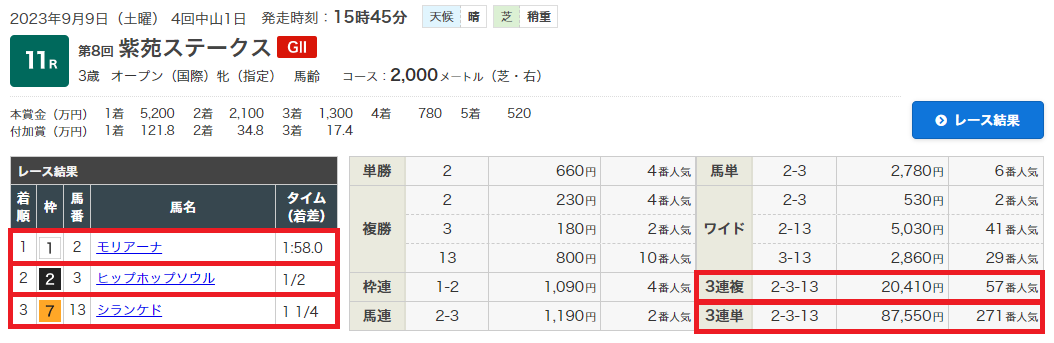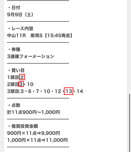 9日(土)紫苑S(G3)で無料情報3連複204.1倍、