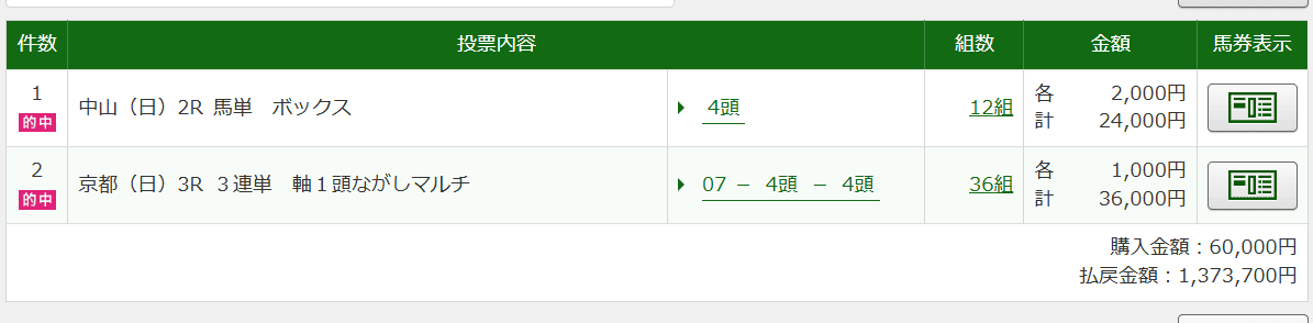 決して高配当とまでは(100万円以上)とはいきませんが 堅実的に10~20万円前後の配当的中してます。 今年、金杯開催週から3週連続で的中しているので明日も楽しみです、この一番新しい的中は27万3490円払い戻しでした。