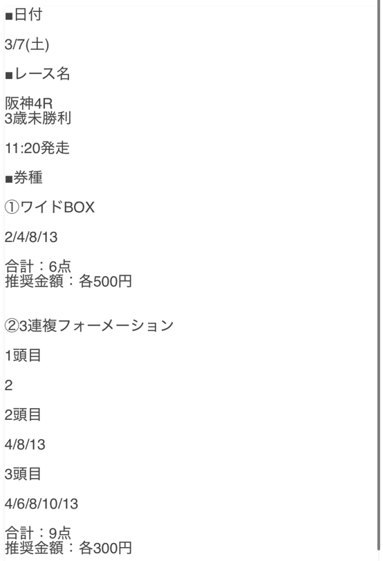 今日の無料情報3/14(土)なかなか4点で三連複当てられません💦 素晴らしい予想でした。