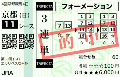 エリザベス女王杯3連単万馬券的中貰えました!この的中はマジで嬉しいっすね~3着ライラックこりゃ取れないって普通の予想じゃ!